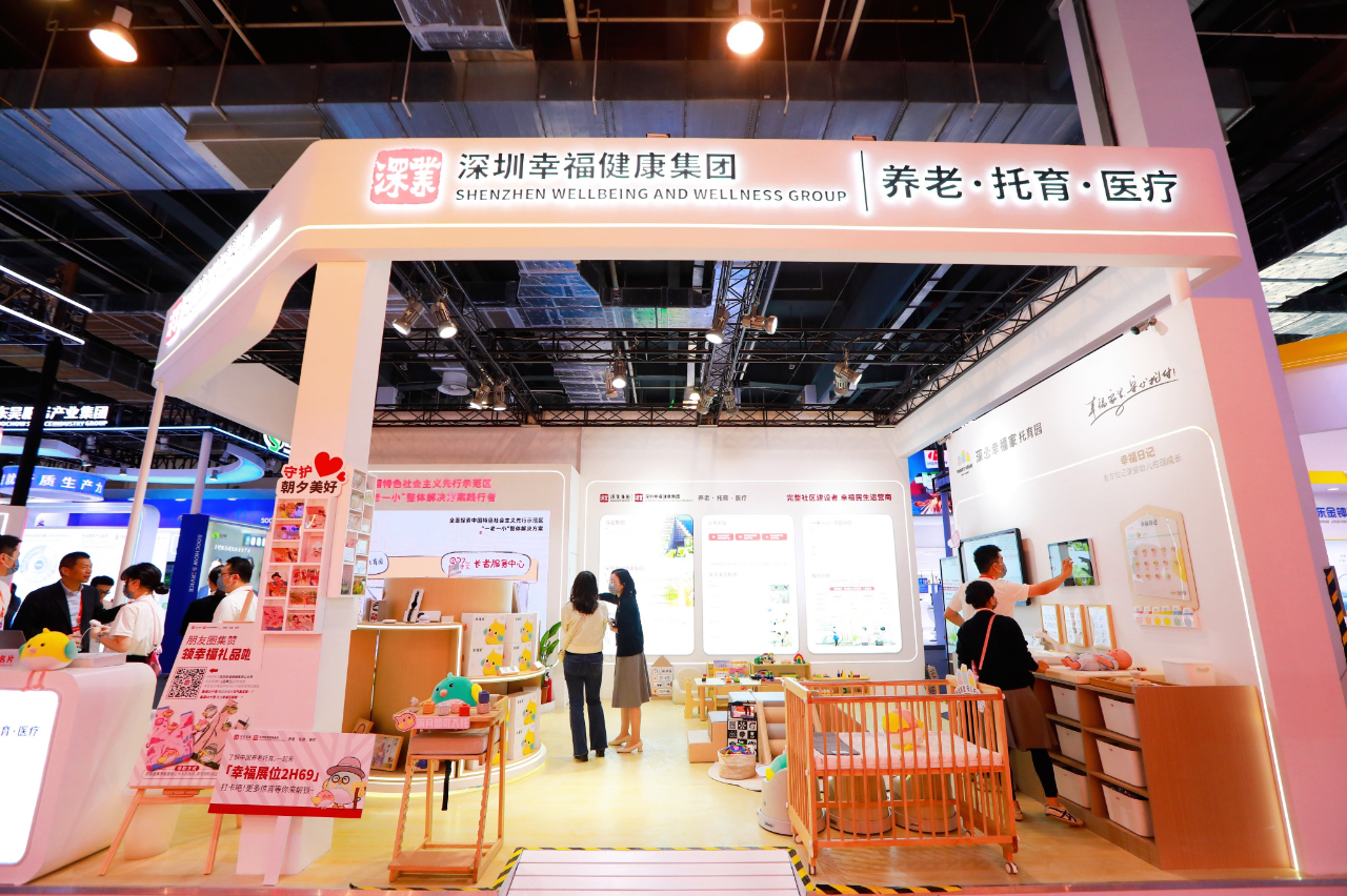 在展厅,深圳幸福健康集团特设板块展示了历时四年建设的“深业幸福家”托育品牌、“深业健康家”养老品牌和“一老一小”整体解决方案,集中呈现了养老、托育、医疗业务“规模化、高质量、品牌化、智慧化”发展成效,特别是在养老托育标准制定、体系研发和人才培养等领域的探索经验,全面展现中国特色社会主义先行示范区在“一老一小”民生领域的改革创新成果。