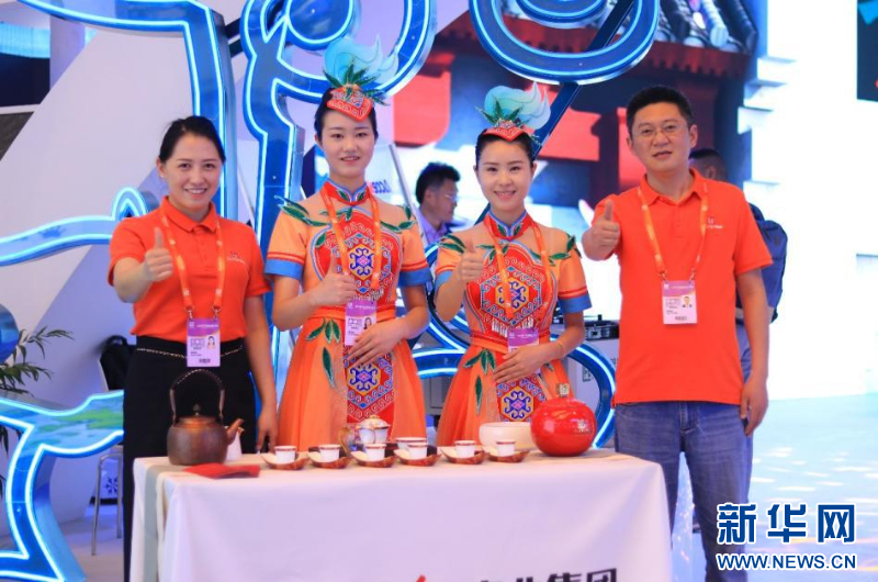 来自乖幺妹土家族织锦基地的非遗传承人现场展示国家级非遗项目土家族织锦技艺,张家界市茅岩莓茶有限责任公司的茶艺师现场介绍茅岩莓茶功效和作用以及莓茶的营养,邀请参展商现场品尝泡好的茅岩莓茶。